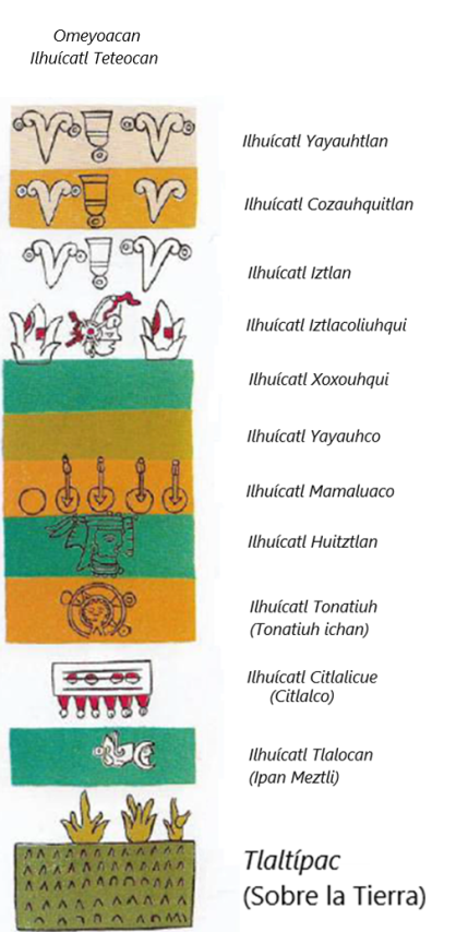 […] Los trece cielos, [estaban] habitados por deidades. En el primer cielo [Ilhuícatl Tlalocan] la luna y [donde] se forman las nubes. En el segundo, están las estrellas, ahí vive Citlalatónac, la Vía láctea y Citlalicue, los dioses del cielo nocturno. En el tercero se halla el Sol. En el cuarto, está Huixtocíuahtl (la diosa de la sal). En el quinto […] las estrellas errantes, los cometas y el fuego. En el sexto está el cielo verde. En el séptimo, el azul, donde vive Huitzilopochtli. En el octavo crujían los cuchillos de obsidiana. El noveno era el cielo blanco. El décimo el amarillo. El onceavo es el rojo y el doceavo y treceavo eran un cielo doble, donde vivían los dioses creadores: Ometecuhtli y Omecíuahtl. […] En el inframundo moraban los dioses de la muerte [Fig. 3]. (Gallegos, 1991: 14-16)