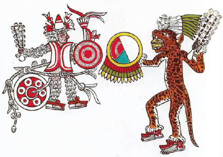 […] Cada uno de los puntos cardinales del Universo era morada de un díos; en el Norte [Mictlampa] moraba Tezcatlipoca, cuyo color era el negro […] En el Sur [Huiztlampa] se hallaba Huitzilopochtli, dios del sol y de la guerra. En el Este [Tlahuiztlampa], Xipe Tótec, dios de la siembra, de color rojo. Y en el Oeste [Ciuatlampa], Quetzalcóatl, dios del viento, de color blanco.