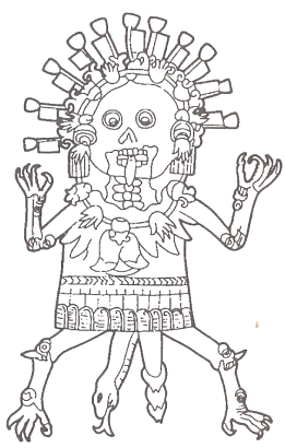 En la visión del pueblo mexica, la vida y la muerte se encuentran unidas y pueden entenderse como dualidad complementaria y aún, que se trata de lo mismo, por lo que el principio de identidad no operaría en tal cuestión, circunstancia que se proyecta en el panteón mexica, que tenía varias divinidades asociadas con la muerte, aún Tláloc, Tonatiuh y Ometéotl. Asimismo, todo lo relacionado en directo con la muerte, solía ser representado con el cuerpo descarnado o fardos mortuorios, una calavera en lugar de cabeza, ojos estelares, puntos o manchas corporales que indican el estado de descomposición, así como la presencia de ciertos animales como el tecolote, araña, ciempiés y alacrán (Fig. 5). (Cabrero, 1995).